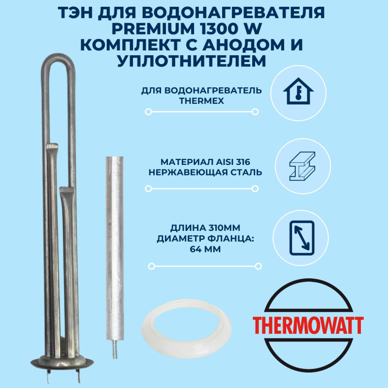 ТЭН 3170518 от производителя Thermowatt - это высококачественный нагревательный элемент, предназначенный для использования в различных водонагревателях и бойлерах. Благодаря своим характеристикам, он обеспечивает эффективное и равномерное нагревание воды.Характеристики:Модель: 3170518Тип: RF Мощность: 2000 ВтНапряжение: 230 ВДлина ТЭНа: 235 мм (365 мм)Диаметр фланца: 92,5 ммМатериал фланца: AISIГлубина фланца: 15,5 ммДиаметр трубки ТЭНа: 8,5 ммМатериал ТЭНа: AISI 316LДлина трубки: 770 ммУдельная поверхностная мощность: 11,2 Вт/см²Контакты: ФастоныДиаметр трубки термостата: 12 ммМатериал трубки термостата: AISIДлина трубки термостата: 365 ммКрепление анода: M6Технология: ТЭНы из нержавеющей стали – фланец Ø92Замена старого кода: 000317012100Производитель: Thermowatt - известный производитель высококачественных нагревательных элементов, гарантирующий надежность и долговечность своей продукции.ПреимуществаВысокая эффективность: Благодаря мощному и качественному нагревательному элементу, ТЭН обеспечивает быстрое и равномерное нагревание воды.Надежность: Изготовлен из высококачественных материалов, что гарантирует длительный срок службы и устойчивость к коррозии.Закажите ТЭН 3170518 (RF Ø92 AISI 316L, 2000W 230V) от производителя Thermowatt прямо сейчас! Обеспечьте надежное и эффективное нагревание воды в вашем водонагревателе или бойлере.